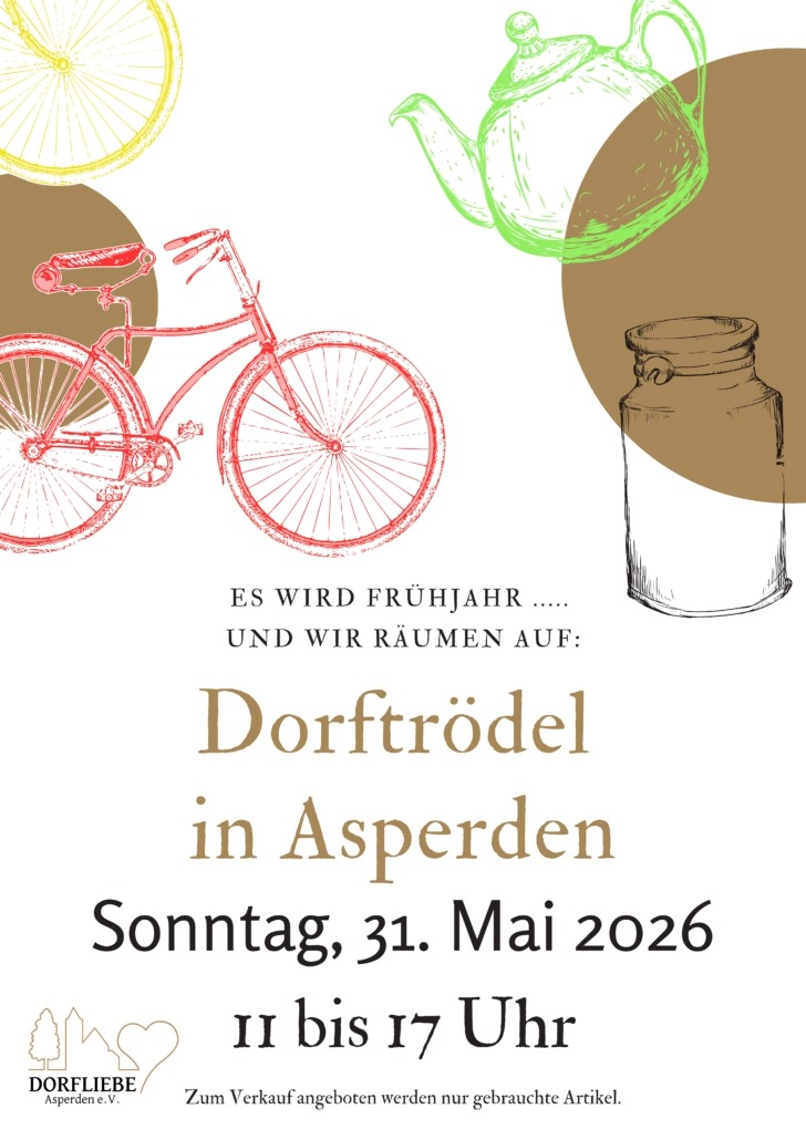 Asperden.: Am Sonntag, 31. Mai 2026, findet erstmals der Dorftrödel in Asperden statt. Organisiert wird die Veranstaltung vom Verein Dorfliebe Asperden e. V., der damit eine neue Möglichkeit zur Begegnung im Ort schaffen möchte.